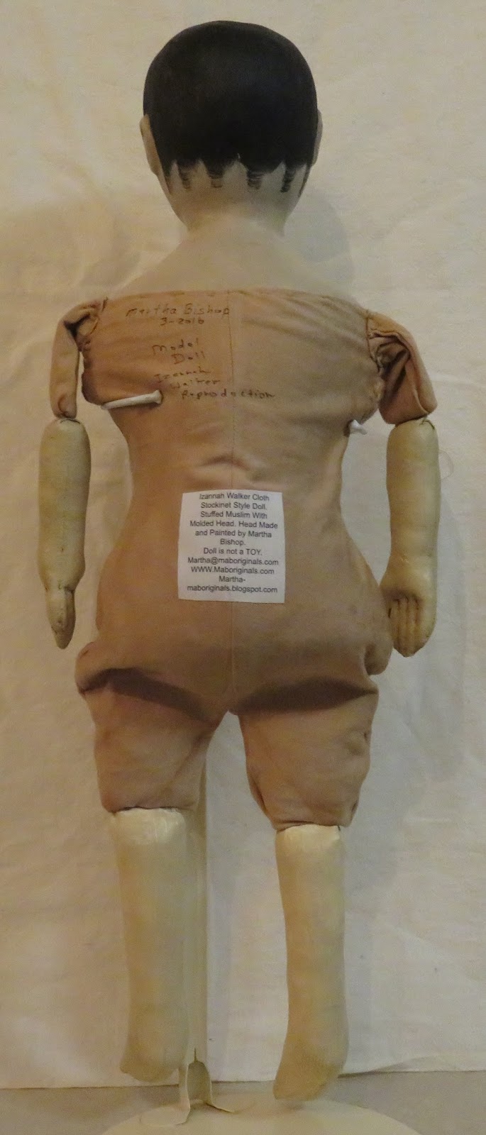 Well, I hope everyone is doing good and working, despite the terrible heat. I mentioned this before, but, even though it doesn't effect the doll making, it sure does make all other jobs harder. Making a good deal of progress on several dolls, I am showing this new doll today, even though her photographs aren't the best. the lighting wasn't right, but I wanted to show her anyway. She is very serious looking, more than the antique I copied her from. The other doll was dark eyed with very dark hair, but a sweeter expression. this girl is sweet too, but not as much. This particular mold is probably one of my favorite ones. It is a nice size and has that great Izannah shaped head. She had a lot of different head molds, and I have never seen anyone try to make a copy of this doll, but me. Among the different dolls I have been working on are two new Alabama babies. I am making them like the early ones with the big flappy ears. these old black dolls are never seen up for sale. You see lots of white Alabama dolls, and a few of the newer black molds Ella Smith made, but not the very early black ones, I am here to tell you that making these Alabama babies is pain staking work, probably more than the Izannah dolls. Another set of dolls in the works are three of the tiny Izannah dolls about 9 to 10 inches. These little dolls are also tons of work. I have just about hand sewed two dresses so far. My new Izannah plaster molds are made, but no cloth heads from them yet. Hopefully I will be wrapping up some of these dolls that have taken so long and can move onto the new heads, I am excited to see how they turn out. Making the dresses for the two black Alabama dolls is something I do look forward to. Happy doll making and a happy summer to everyone.