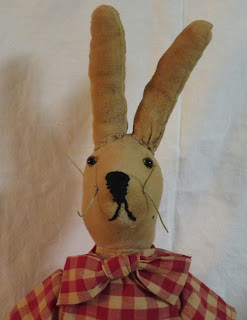 Hi. Today I am putting up pictures of my antique Ella Smith Doll or Alabama Baby Doll, which is so amazing. This doll is 27 inches tall and such a beauty. I just could not pass her by, she has loads of charm and her hair painting is, to me. a wonder and a inspiration for hair painting on my other dolls. I have seen lots of pictures of alabama babies and I have another antique one, but the hair painting and the face isn't anything alike. This girl is enormous. So big she is actually hard to carry, and her legs are super fat. I forgot to take a picture of her original dress, but I will do that next time, as I have to make some absolutely necessary repairs, as her arms are about to fall off. Her dress is pretty, but super fragile and I hope to repair it. I have also finished two of the three painted head rag dolls for two of my friends. It took me a long time to make these dolls, partly because I was doing two and I wanted to take extra time and try not to make mistakes. On the subjects of making mistakes, I have to say, no matter how careful you are and paying attention, mistakes will occur. On these two, if I made a mistake and was able to fix it, I went back and did things over, that is why I was long in making them. Another reason, I took a long time as I was trying to age the Indigo homespun fabric. Let me tell you what I have found out about trying to age fabric, atleast the blues. REMEMBER THIS PEOPLE. If you want old looking fabric, buy it old, as blues don't like to be subjected to lemon juice, tiny amounts of bleach water, washing repeately or being strung out in the sun for days on end. Should I go on as to what to try, such as I have heard people running over their fabric with the car or scrubbing it on a rocky bank, or actually putting holes in it. HaHa I learned blue fabrics will most always go purple, not a lighter blue, if you try to lighten them. Back to the dolls. I love these two girls and learned much from working on them. I was lucky to be given an antique doll quilt to dismantle to make the bonnets. I think these are my best ones so far. Such a joy to work with the old fabrics. Next, long ago I made two rabbits on stands. My mama made a dress for one to give to my sister. I think she did good. Lastly, I made a decision to buy shoes for the time being instead of making them, as I need to take a shoe making class. It is worth the expense to to this, and forget about ever trying to make socks. I, at this point in my doll making, refuse to even try to make a pair of socks. HaHa Well, my time is over. Good Bye.