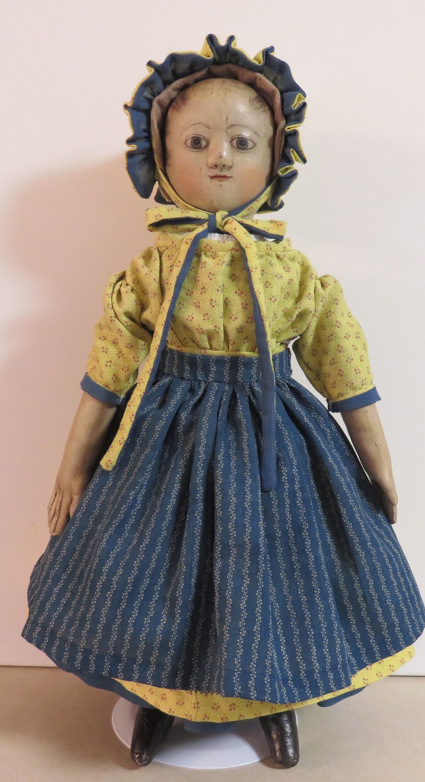 Here are two finished dolls I have spent quite alot of time on. I made a large Ella Smith ( Alabama Baby Doll ) and a Izannah Walker Style Cloth doll. Both of these dolls have cloth heads and bodies. The alabama doll has a cloth head with a pressed mold face made from my antique doll's face and the Izannah doll has a pressed cloth head also made in a mold. The very early black Alabama dolls are hard to find and buy, also super expensive, so I have made some here and there, this is the largest one I have made so far. Due to paint issues and not having much time to work on the dolls, I don't have many dolls to show today, but I have made atleast three other Izannah dolls that have to sit up for atleast a month for drying and then clothes making, so hopefully in a month or so, I will have some more dolls. Going into the spring and summer, I thought I would try my hand at making a Philadelphia doll, as I now have one to make a mold of, and I would like to make some little black dolls,made in the way of the Izannahs, but just little simple black babies. Another project to do is to make molds of my large Izannah dolls that are about 29 inches tall. I had molds, but I re worked them and now have to make new molds. I am looking forward to seeing other dolls people are making and continuing enjoying my doll making days.